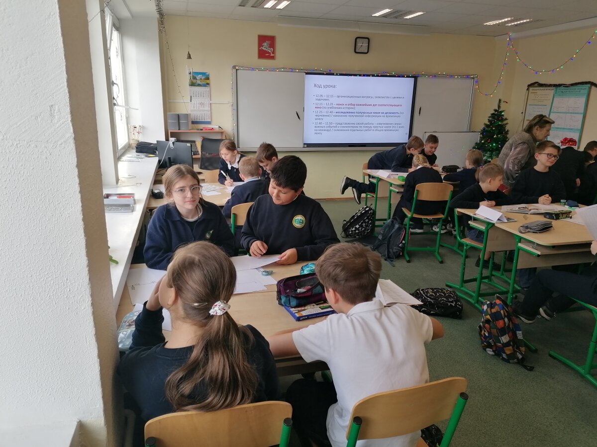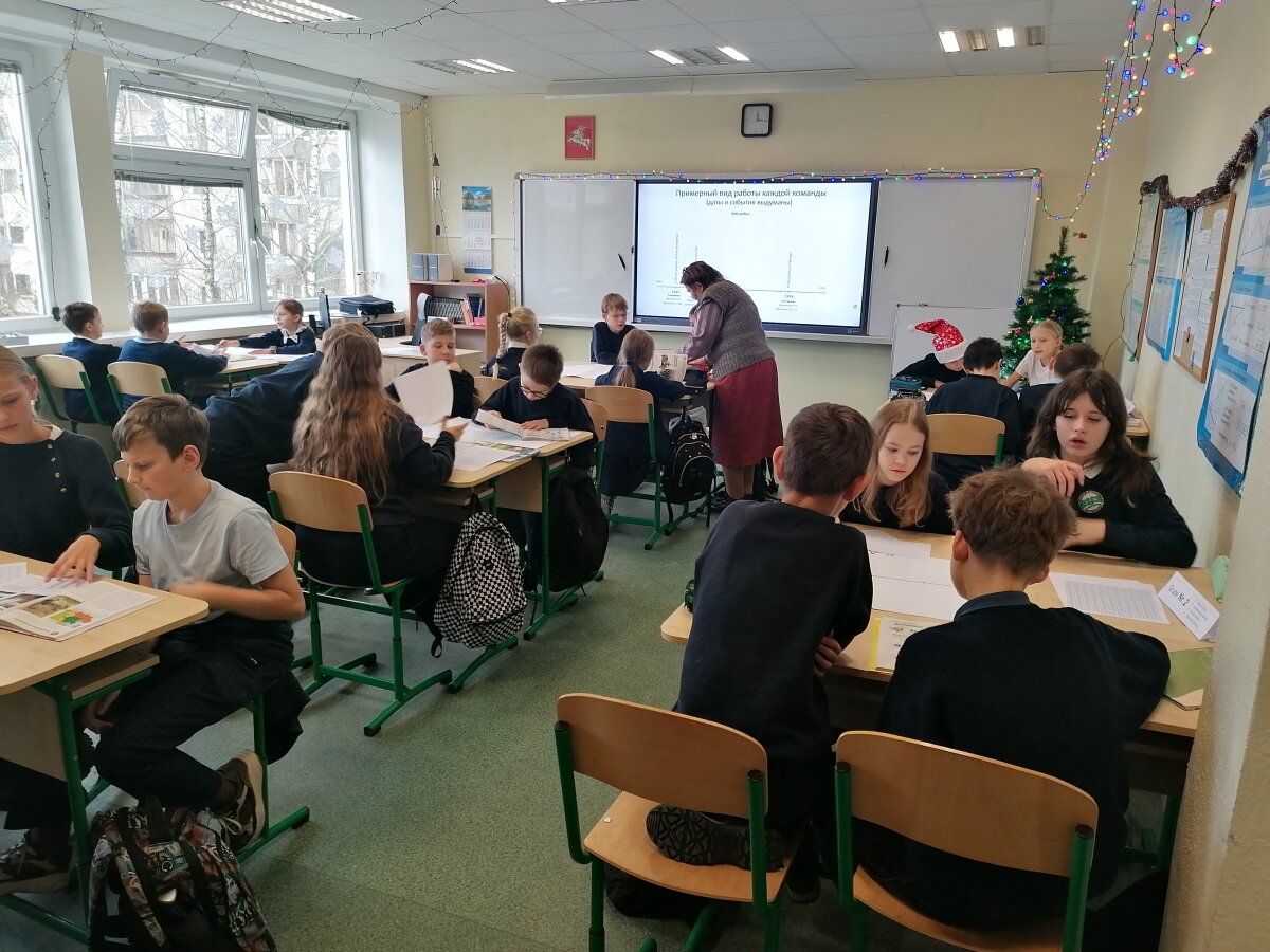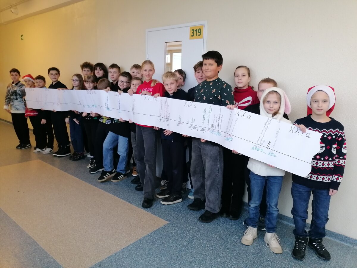 Gruodžio 11 dieną 5c klasėje vyko integruota matematikos ir istorijos pamoka „Pirminiai ir sudėtiniai skaičiai svarbiausiose Lietuvos istorijos datose“. Dirbdami komandomis, mokiniai turėjo įvardyti svarbiausias pasirinkto laikotarpio datas, pažymėti jas laiko juostoje ir ištirti užrašytų skaičių dalumą. Pamokos rezultatas – ilga XIII iki XXI amžiaus istorinė laiko juosta. Mokiniai papildė savo žinių ir įgūdžių bagažą bei įgijo geros komandinio darbo patirties.