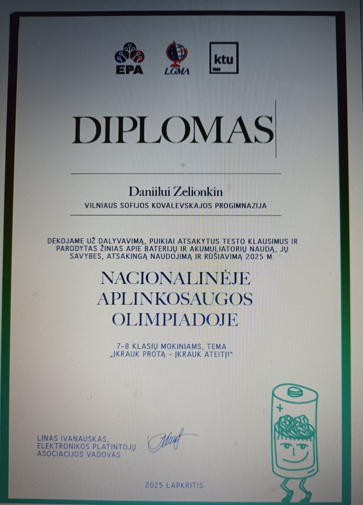 Sveikiname 8a klasės mokinį Daniilą Z. , puikiai pasirodžiusį olimpiadoje, pademonstravusį puikias žinias apie baterijų ir akumuliatorių naudą, jų savybes bei atsakingą naudojimą ir rūšiavimą. 7 ir 8 klasių mokiniams dėkojame už aktyvų dalyvavimą olimpiadoje.