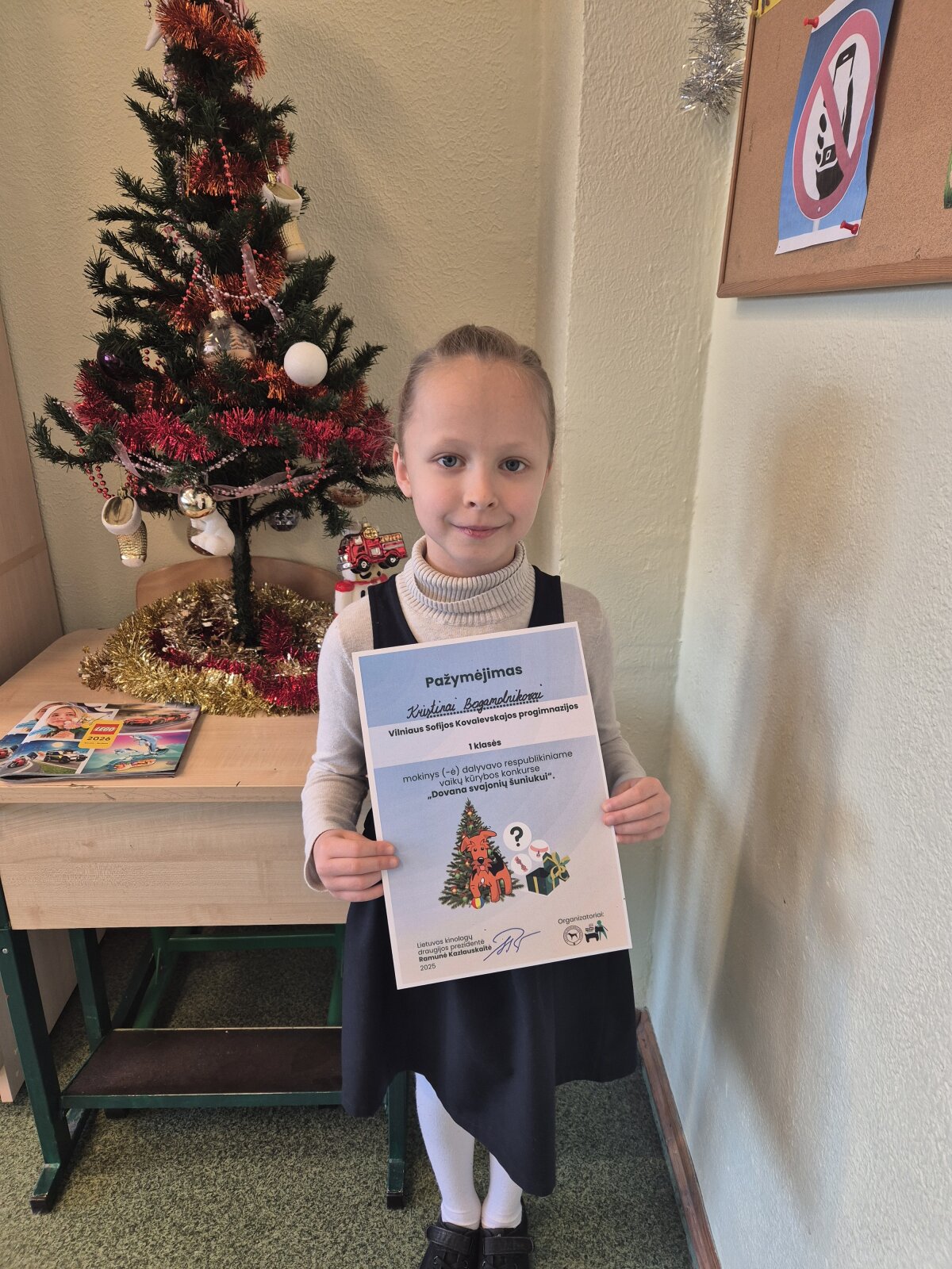 Gruodžio mėnesį progimnazijos 1b klasės mokinė Kristina Bogamolnikova dalyvavo respublikiniame vaikų kūrybos konkurse ,,Dovana svajonių šuniukui“. Konkurso tikslas — priminti vaikams apie pareigą rūpintis mažesniais ir silpnesniais, kalbėtis apie pagarbą, skleisti gyvūnų gerovės ir meilės augintiniams svarbą. Geriausiai įvertinti mokinių darbai eksponuojami Lietuvos kinologų draugijos renginiuose, miestų bibliotekose, įvairiose edukacinėse erdvėse.