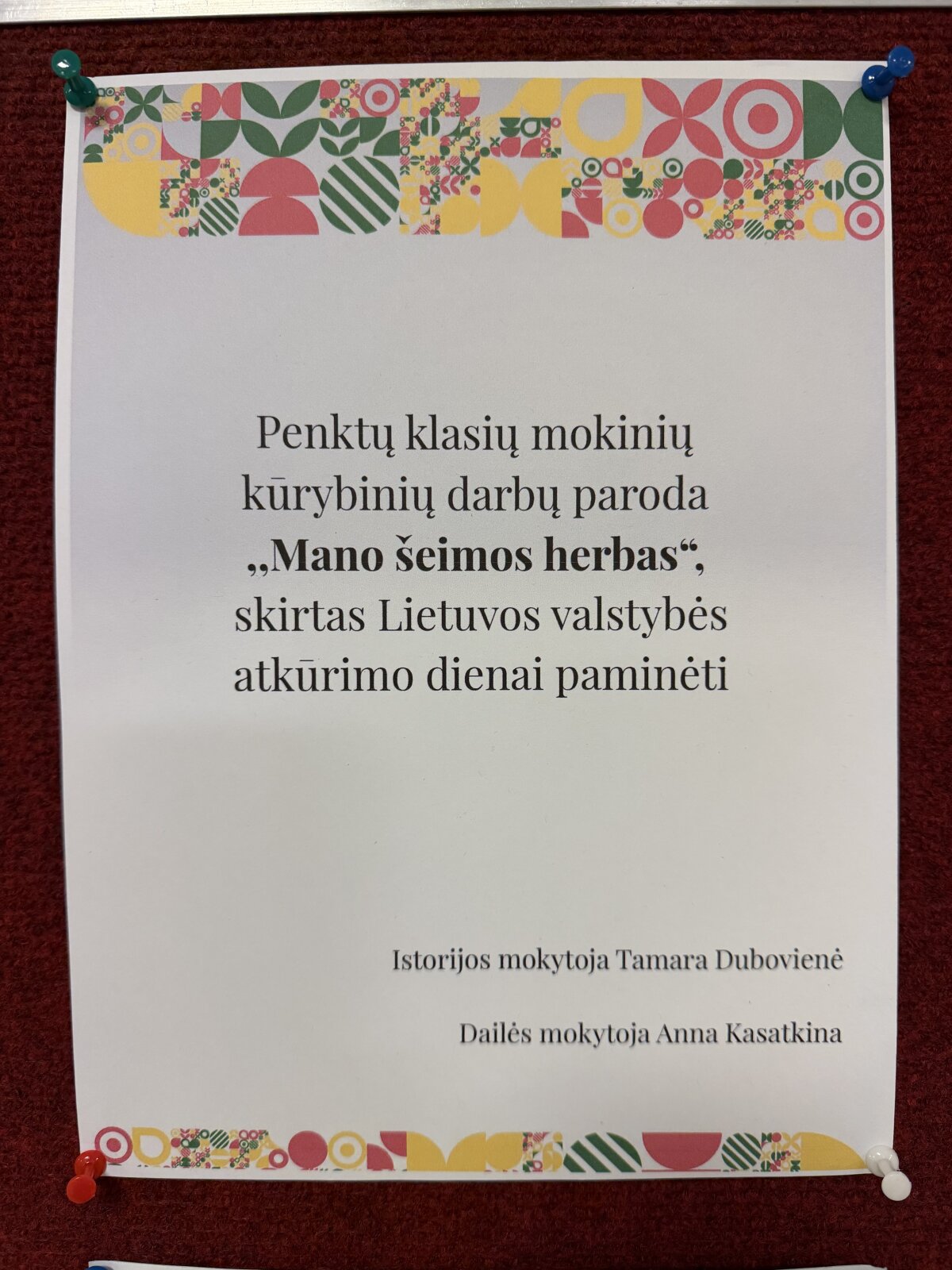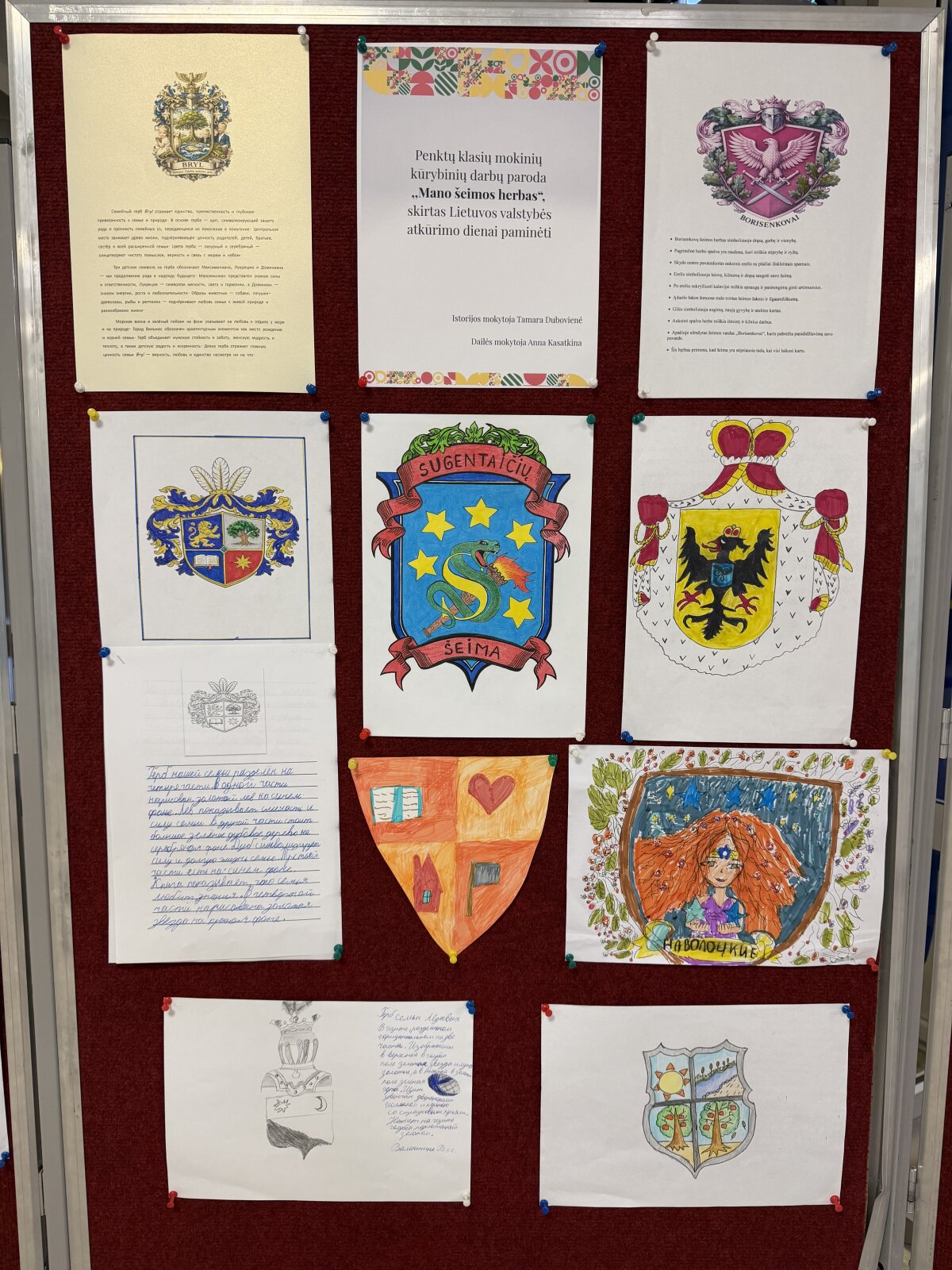Penktų klasių mokinių kūrybinių darbų paroda „Mano šeimos herbas“, skirta Lietuvos valstybės atkūrimo dienai paminėti.