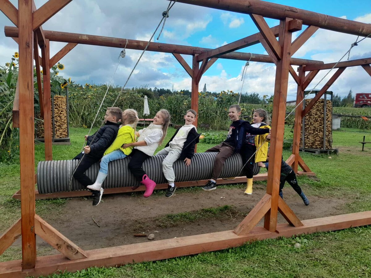Vaikai įveikė labirinto užduotis, keliavo „karvučių traukinuku“ po kaimą, išbandė gravitacinį nusileidimo vamzdį ir kukurūzų grūdų SPA, pasivaikščiojo po fazanų, vištų, zuikučių ir ožkyčių ūkį, šokinėjo per šiaudų salas.