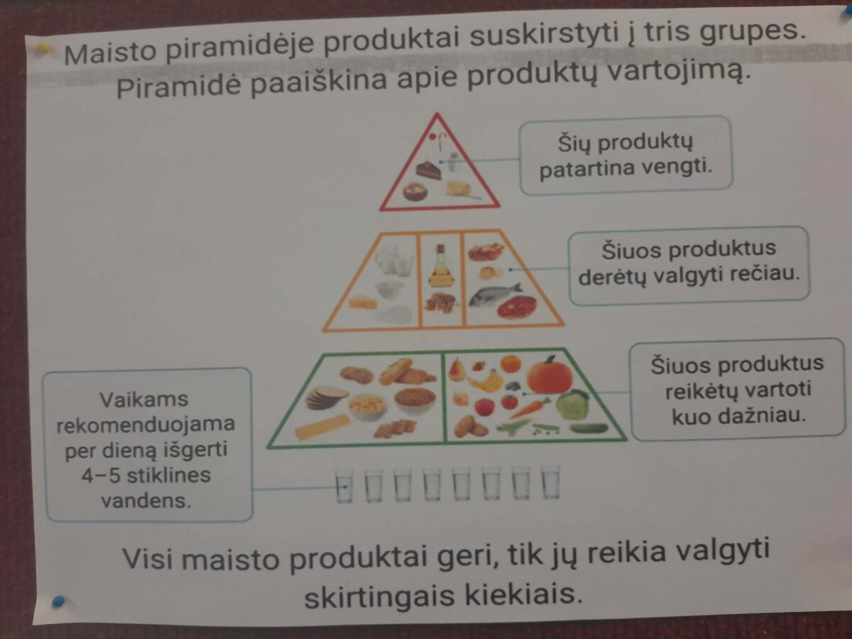 Sausio 29 d. 2c klasės mokiniai su mokytoja kalbėjo apie sveikatai palankų maisto pasirinkimą, apie tai, kokių naudingų medžiagų gauname vartodami įvairius maisto produktus. Mokiniai stebėjo ir analizavo savo mitybos įpročius, kūrė asmenines maisto pasirinkimo piramides.