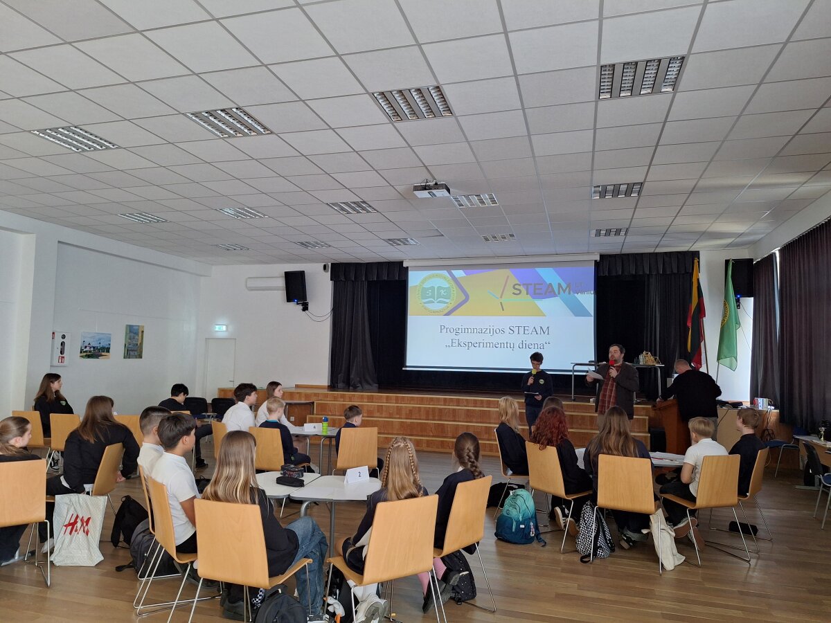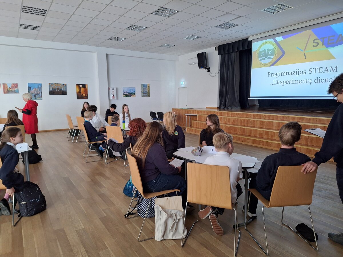 Trečius metus progimnazijoje organizuojama „Eksperimentų diena“ sujungė teorines žinias su praktiniais STEAM projektais. Mokiniai pristatė įvairius bandymus – nuo inžinerinių tiltų modelių iki biologijos ir fizikos eksperimentų, demonstruodami kūrybišką požiūrį į mokslą.
