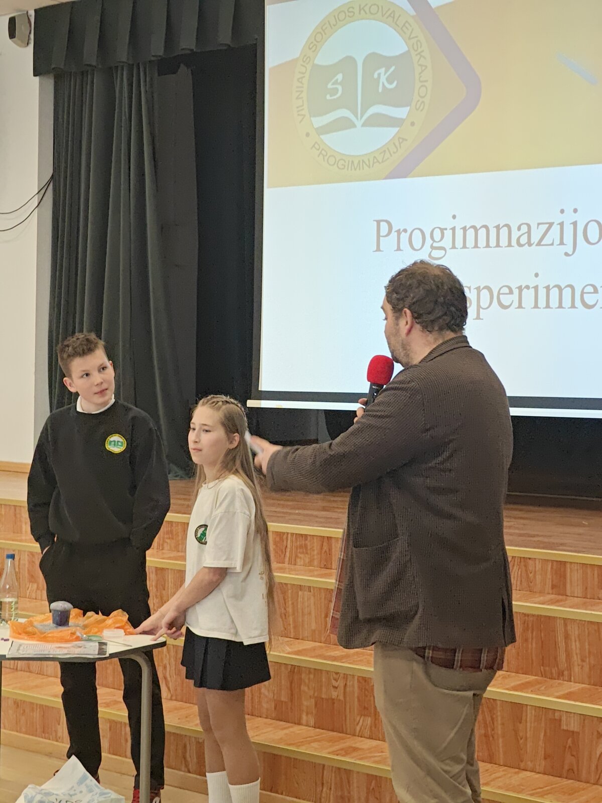 Renginį pradėjo 5c klasės mokinės Emilija Salnikaitė ir Dominika Klevinskaitė. Jos pristatė eksperimentą „Virvės menas“. Vėliau 3c klasės mokiniai Platonas Kitaevas ir Konstantinas Klimkovičius parodė, kaip veikia vandens varpas, o 6b klasės mokinės Elvina Žilinskaitė ir Agata Ustilo pakvietė visus į „matematinį detektyvą“– jos nagrinėjo, kaip procentai naudojami kasdieniame gyvenime, pavyzdžiui, prekybos centre.Ypač daug dėmesio sulaukė 7 klasių mokinių projektai apie tiltus. Trys skirtingos grupės pristatė savo sukurtus modelius ir paaiškino jų konstrukcijos principus. Vyresnių klasių mokiniai nustebino įdomiais eksperimentais: aštuntokai tyrė krakmolo kiekį maisto produktuose, o 6a klasės mokinys Gregori Migal pademonstravo bakterijų vaidmenį jogurto gamyboje.